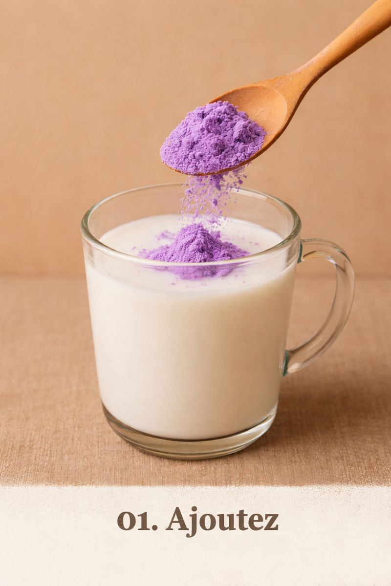 Voir la poudre de taroNature, en taro latte, bubble tea ou dessert maison.